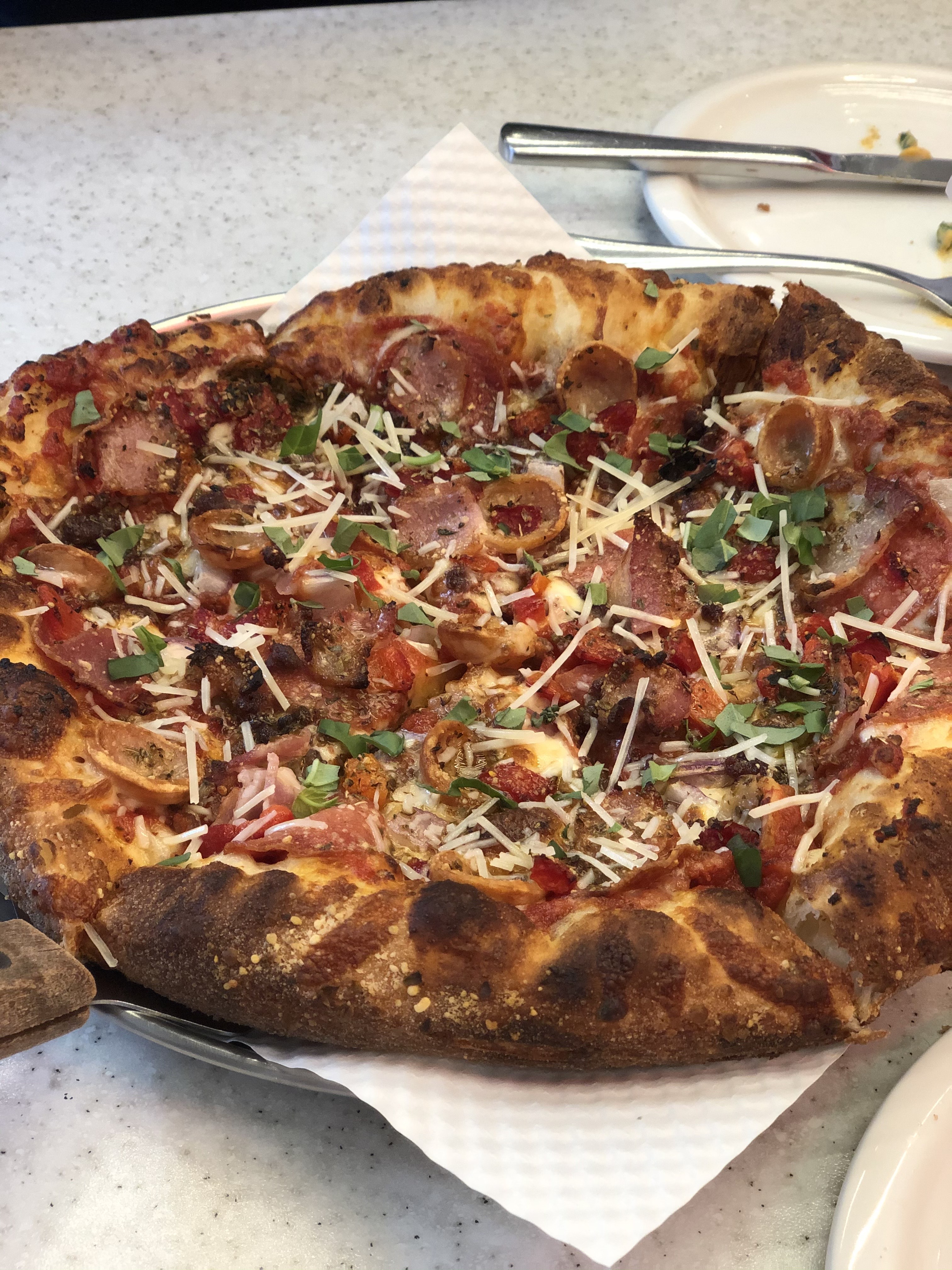 드디어 수퍼잭슨 레귤러 피자가 나왔습니다. 15분에서 20분정도 기다린것 같습니다. 비쥬얼부터가 정말 일반브랜드 피자하고는 다른 것이 확연히 나타납니다. 피자 바깥쪽 빵부분이 정말 두꺼워보였고 바삭해 보이는 비쥬얼이었습니다. 피자 토핑으로는 정말 다양하게 들어있었습니다. 소고기 패티, 베이컨, 소시지, 다양한 치즈들이 토핑으로 올라가 있어서 덕욱더 맛있어보였습니다. 뭔가 막만든것 같지만 피자의 모양과 구색을 다 갖추면서 먹음직스러워 보이는 것이 미국식 피자인건가라는 생각이 들었습니다.