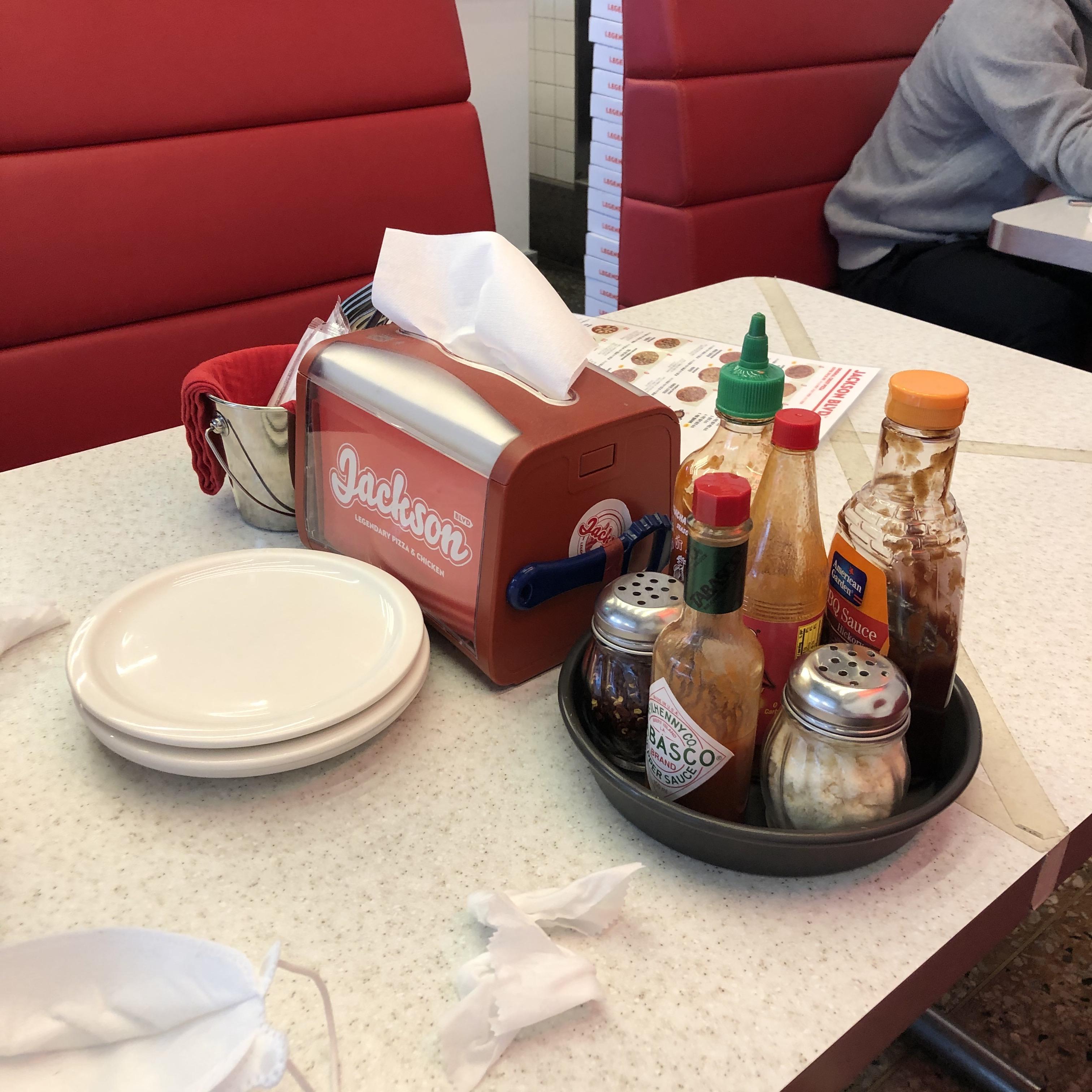 테이블에는 티슈와 접시, 포크와 나이프가 있었습니다. 특히 소스들이 있어서 원하는 소스를 마음껏 조합해서 먹을 수 있었습니다. 각종 핫소스와 치즈가루 등이 있었습니다. 기호에 따라서 이용하시면 될 것 같습니다. 핫소스 종류가 이렇게 많은지 잭슨피자에 와서 알았습니다. 피자를 정말 좋아하시는 분들에게는 정말 좋을 것이라고 생각합니다. 저는 피자 잘알못이라 치즈가루만 뿌려서 먹었답니다.