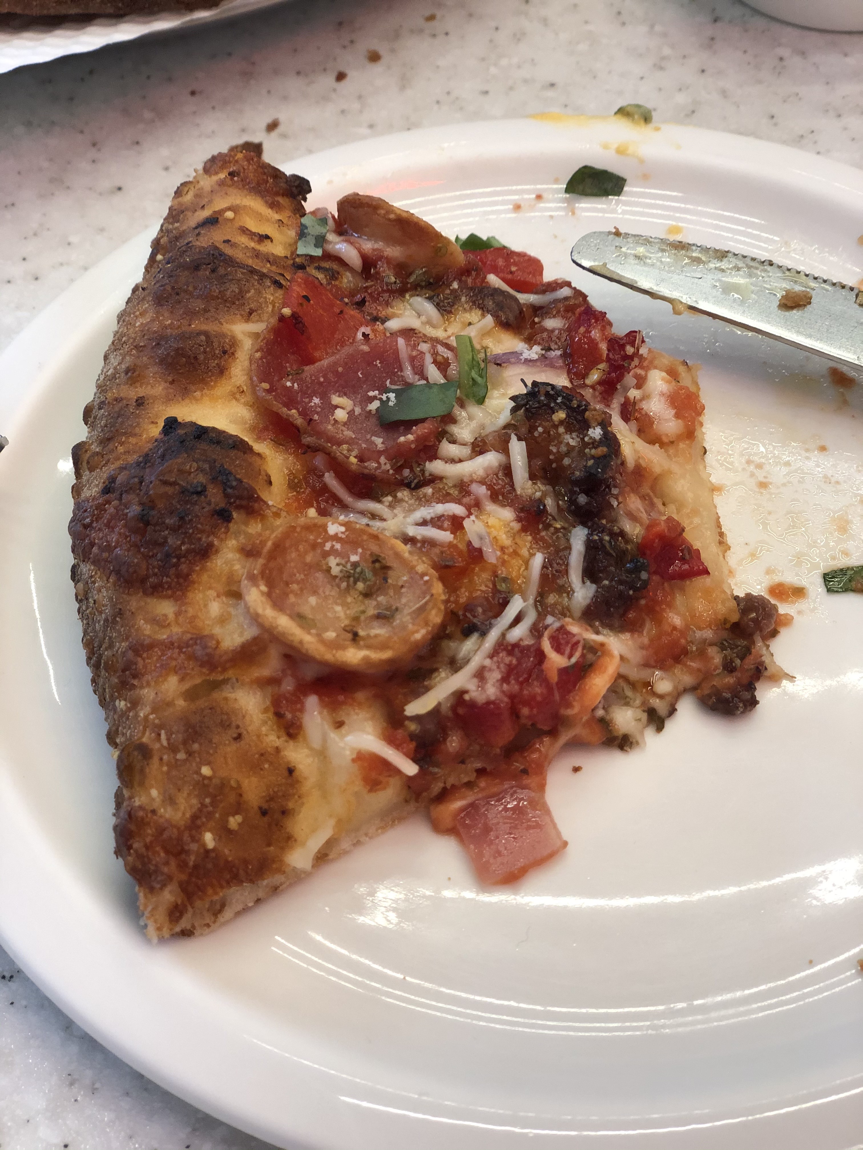 레귤러인데도 작지 않은 크기였고 한조각을 접시에 덜어서 먹어보았습니다. 금방 만든 피자를 바로 먹으니 정말 맛있었습니다. 각종 치즈들이 들어가 있어서 치즈의 고소함과 쫀득함, 담백함을 모두 느낄 수 있는 맛이었습니다. 거기에 토핑으로 올라간 소시지와 베이컨의 짭쪼름함이 정말 잘 이루어졌습니다. 빵도 푸석푸석하지 않고 바삭바삭해서 빵부분도 정말 맛있게 먹었습니다.