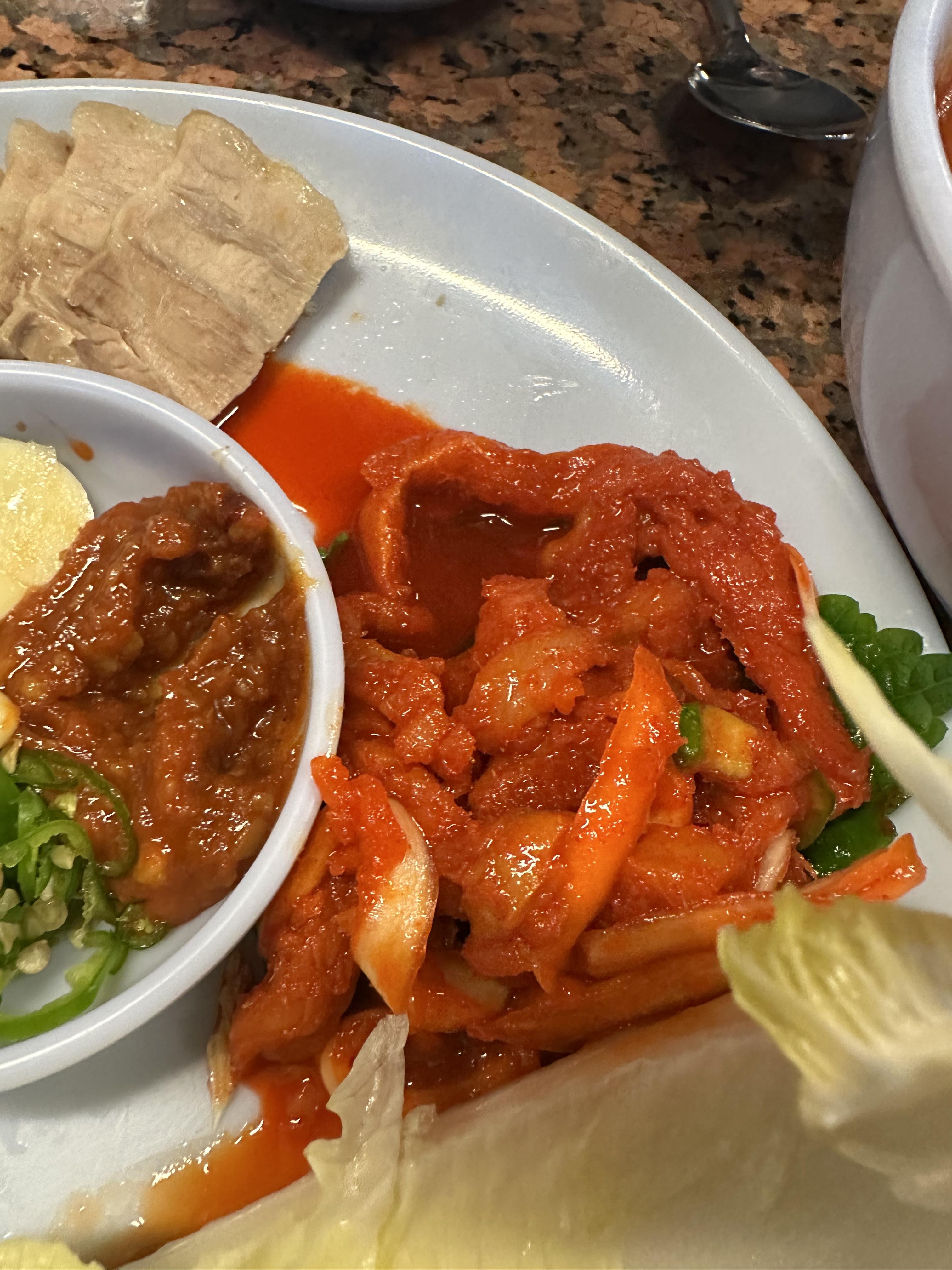 입에서 사르르 녹는 느낌이 들었어요. 살짝 달달하고 짭짤한 양념과 함께 보쌈 김치나 같이 나오는